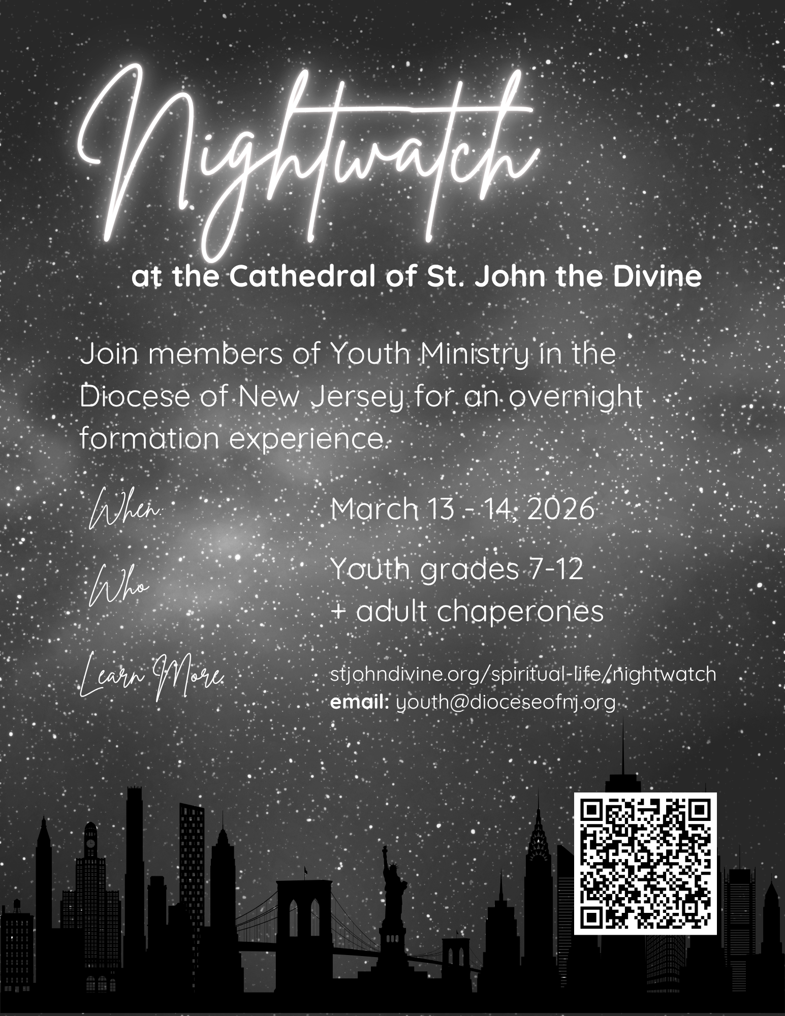 The Diocese of New Jersey is organizing participation in the Nightwatch program at the Cathedral of St. John the Divine in New York City. Dates for this year are March 13-14, 2026.